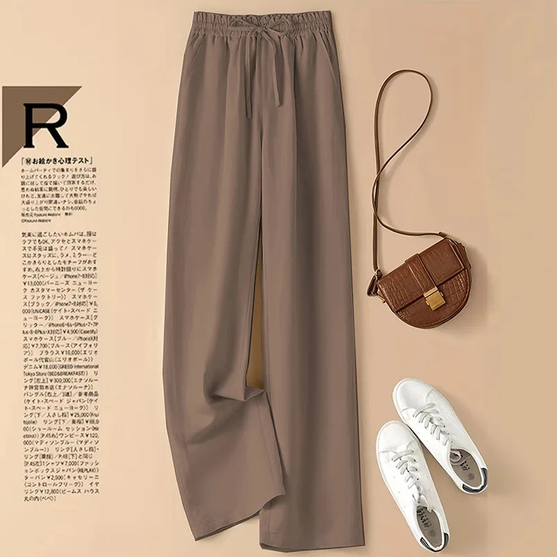 Cotton Linen Casual Wide Leg Pants Women's Summer Fashin Elastic Waist Solid Color Simple Basic Straight Trouser Female Clothes