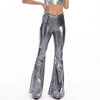 Sexy PU Leather Metallic Pants Shiny Holographic Flare Pants Women Girls Bodycon Elastic Waist Bell Bottom Trousers Clubwear
