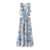 Summer New Arrival Fashion Sweet Women's Flower Print Sleeveless Mid-length Skirt V-neck Waist-exposed Sexy Split Dress