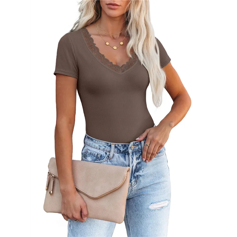 ASDS-Women Short Sleeve Lace V Neck Shirts Ribbed Knit Fitted Business Dressy Casual Summer Blouses T-Shirt