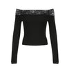 CIBBAR Black Lace Stitched Slash Neck Crop Top Elegant Sexy Skinny Long Sleeve T Shirts for Women Harajuku Y2k Spring Tees Basic