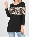 Primarily black with the leopard accent across the chest and upper sleeve - adds the perfect character to your outfit. This top is so soft, comfortable and casual and the length is long enough to cover your bootie!