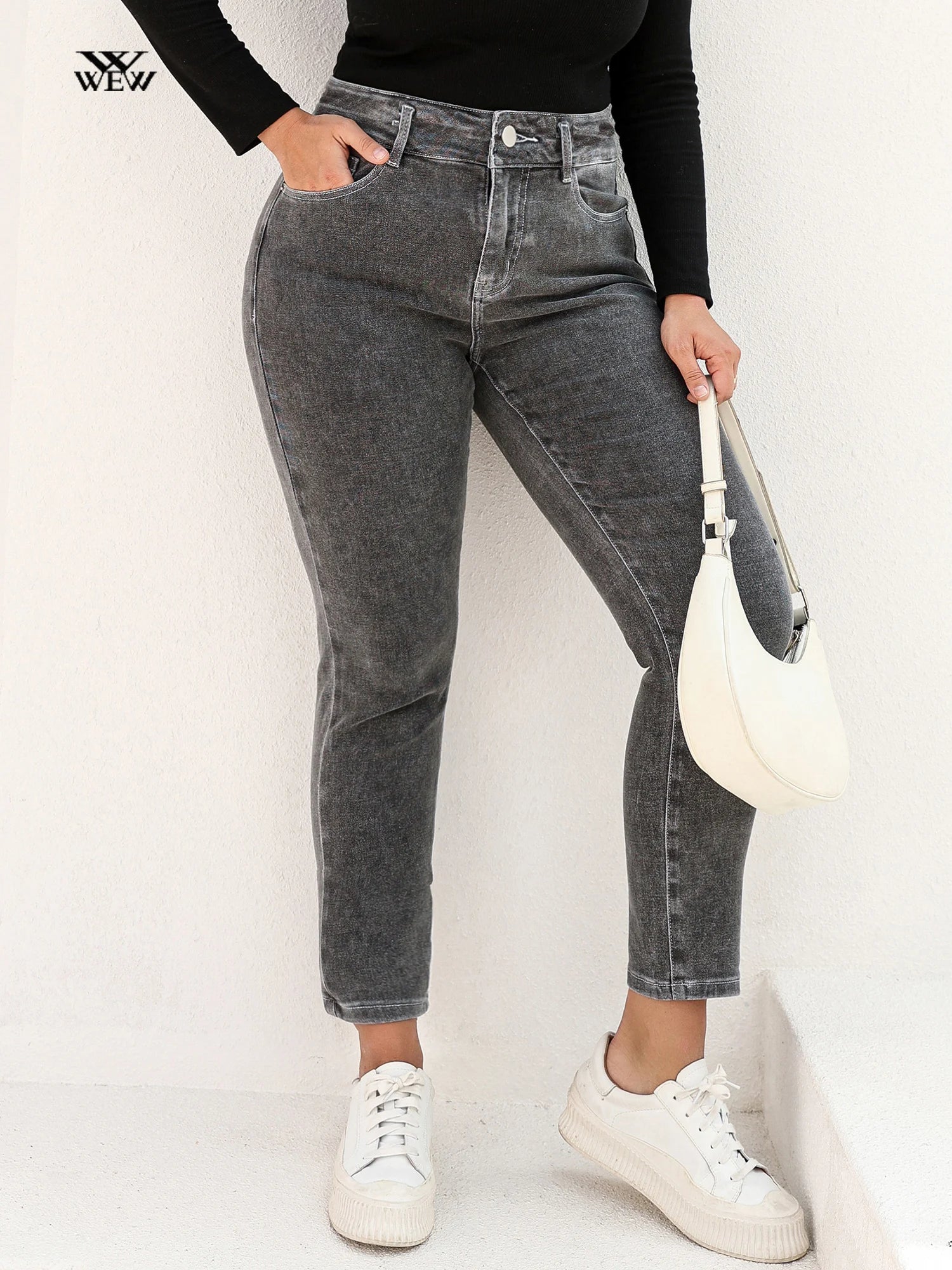 Plus Size Gray Jeans for Women Stretchy High Waist Mom Jeans Harem Full Length Washing Denim Jeans Curvy Fitting 100 Kgs Jeans