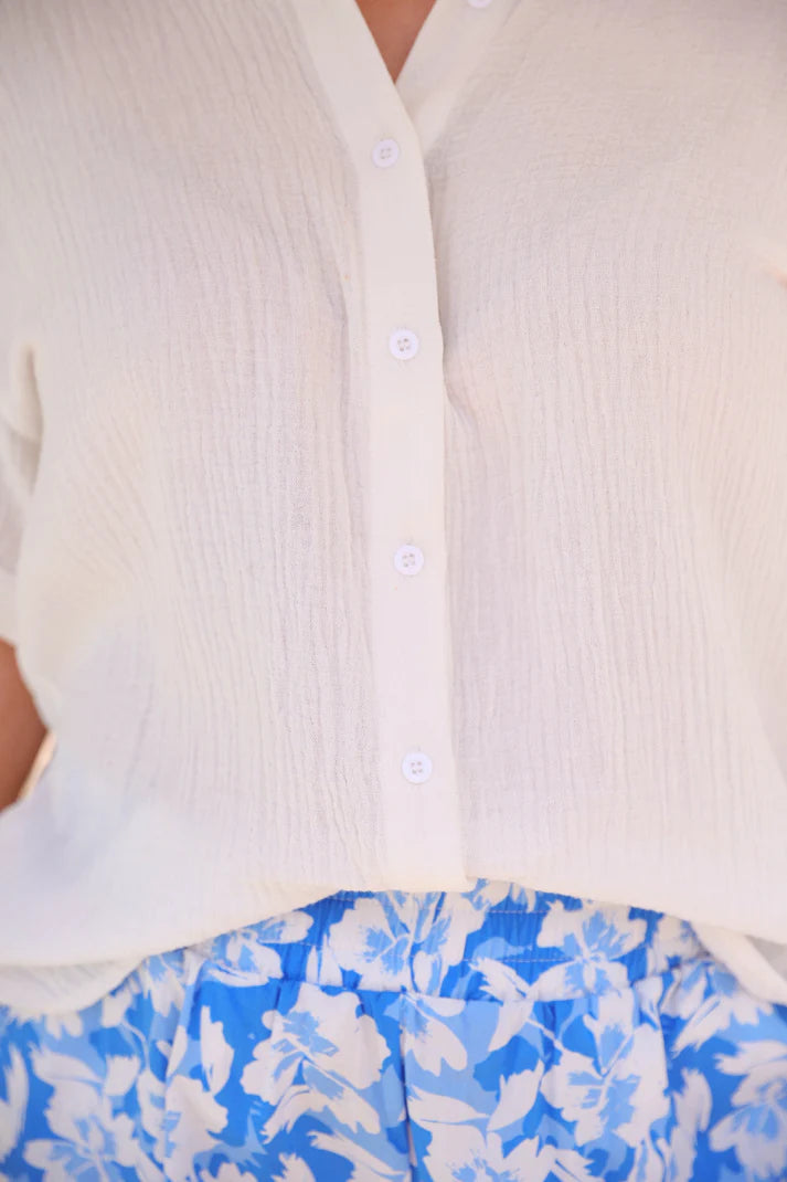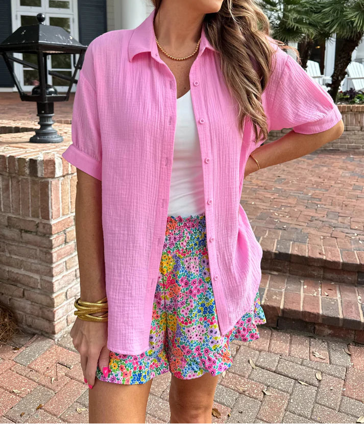 Step into a world of comfort and style with the Sawyer Gauze Top. Made from lightweight, breathable gauze fabric, this top is your perfect companion for warm, sunny days or layered looks during cooler seasons. Stocked in 3 Colors: Blue, Pink, and White