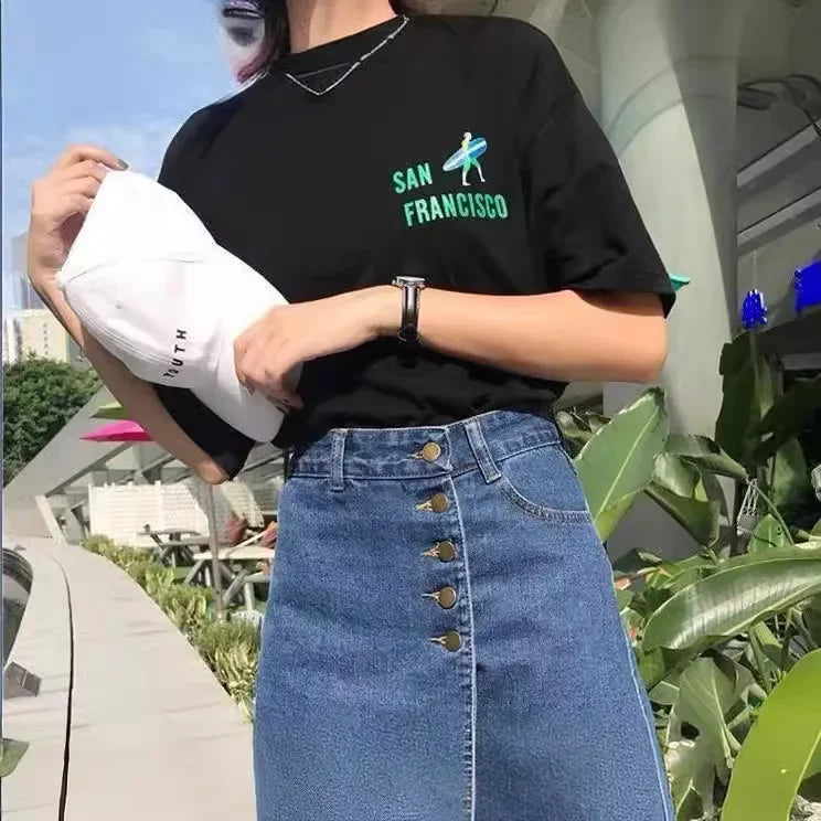 Summer Irregular High-waisted Denim Half Body Skirts, European and American Women's Fashionable Breasted Casual Denim Skirts